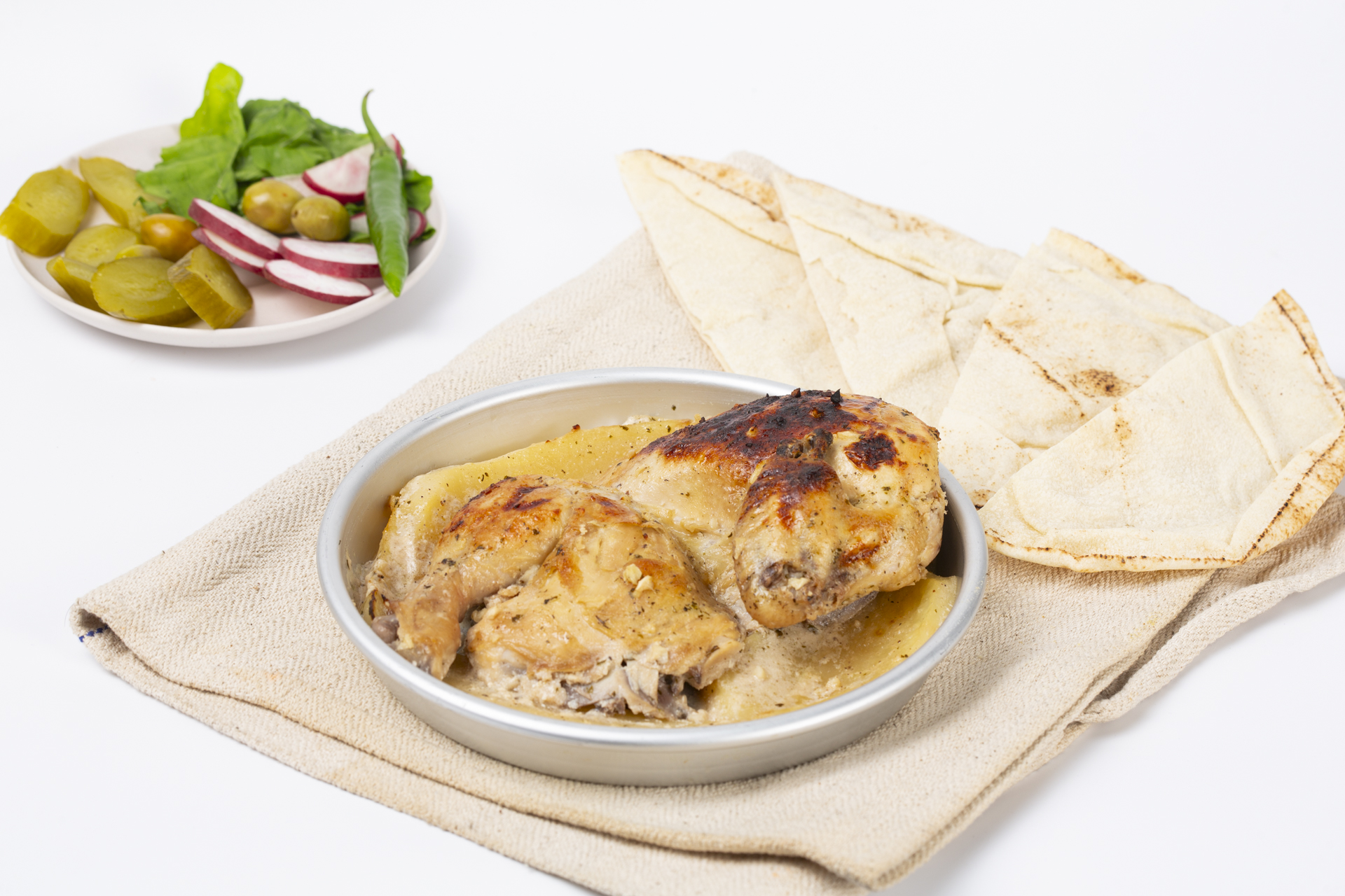 Oven-baked chicken and potato wedges cooked with lemon garlic and warm spices until golden and tender. A bright and comforting Levantine favorite. Served with yogurt and your choice of warm bread or vermicelli rice, pickles and green olives.