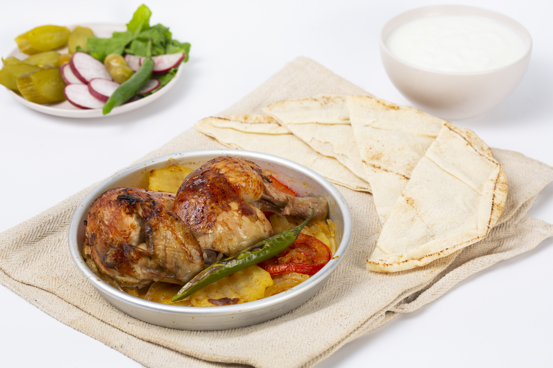 Oven-baked chicken and potato wedges cooked with vegetables and warm spices until golden and tender. A bright and comforting Levantine favorite served with yogurt and your choice of warm bread or vermicelli rice, pickles and green olives.