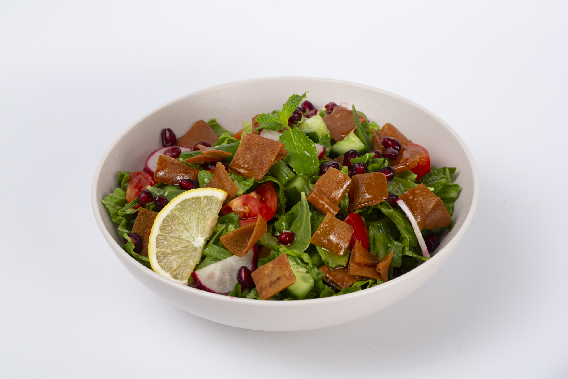 Crisp mixed greens and vegetables tossed with sumac lemon dressing and topped with crunchy toasted bread for a tangy Levantine flavor.