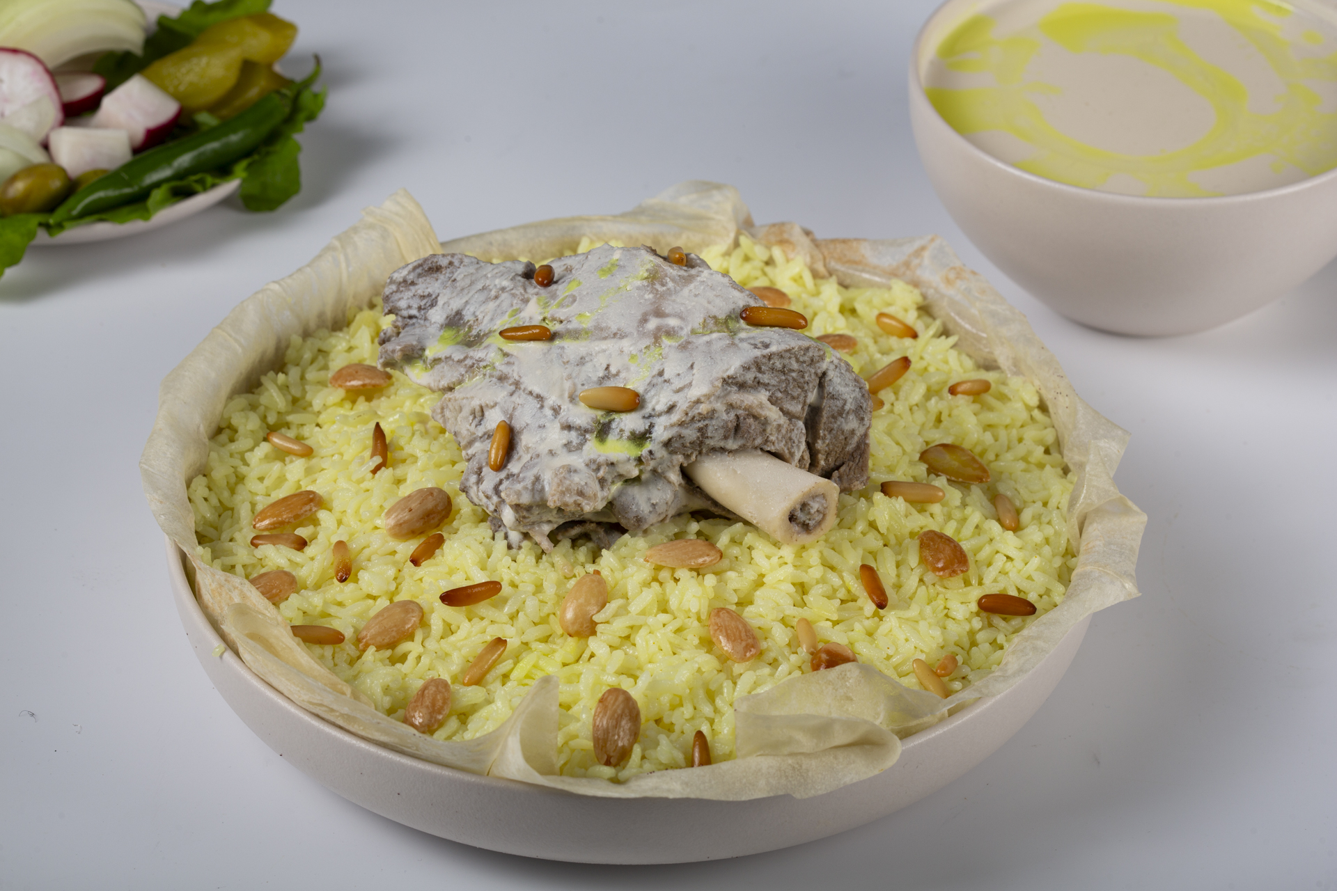The crown jewel of Jordanian cuisine. Tender lamb slow-cooked in jameed and served over fragrant rice finished with ghee and toasted pine & almond nuts. Served with onions, fejel, pickles and green olives.