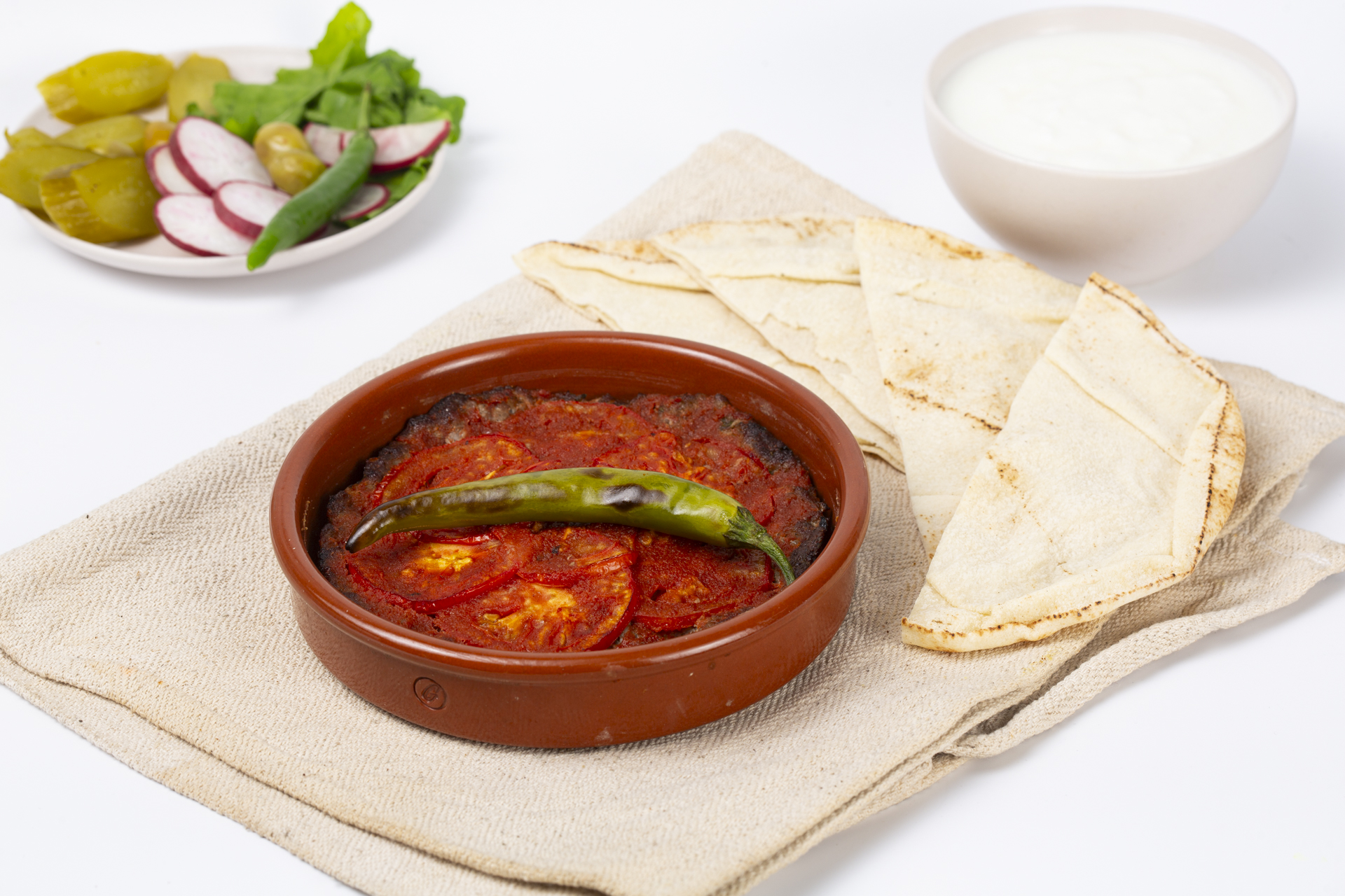 Juicy kafta of lamb and veal cooked in lightly spiced tomato sauce with a touch of green chili. Garnished with crispy potato chips.