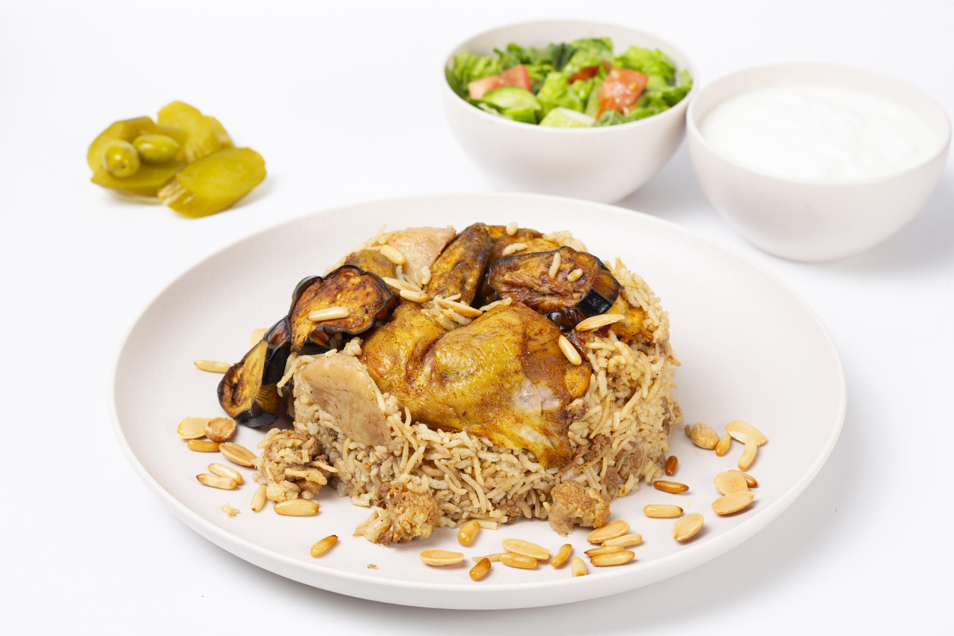 A Levantine masterpiece of layered rice, tender lamb and golden eggplant, cauliflower and potato, flipped to reveal rich flavor. Finished with toasted pine & almond nuts.