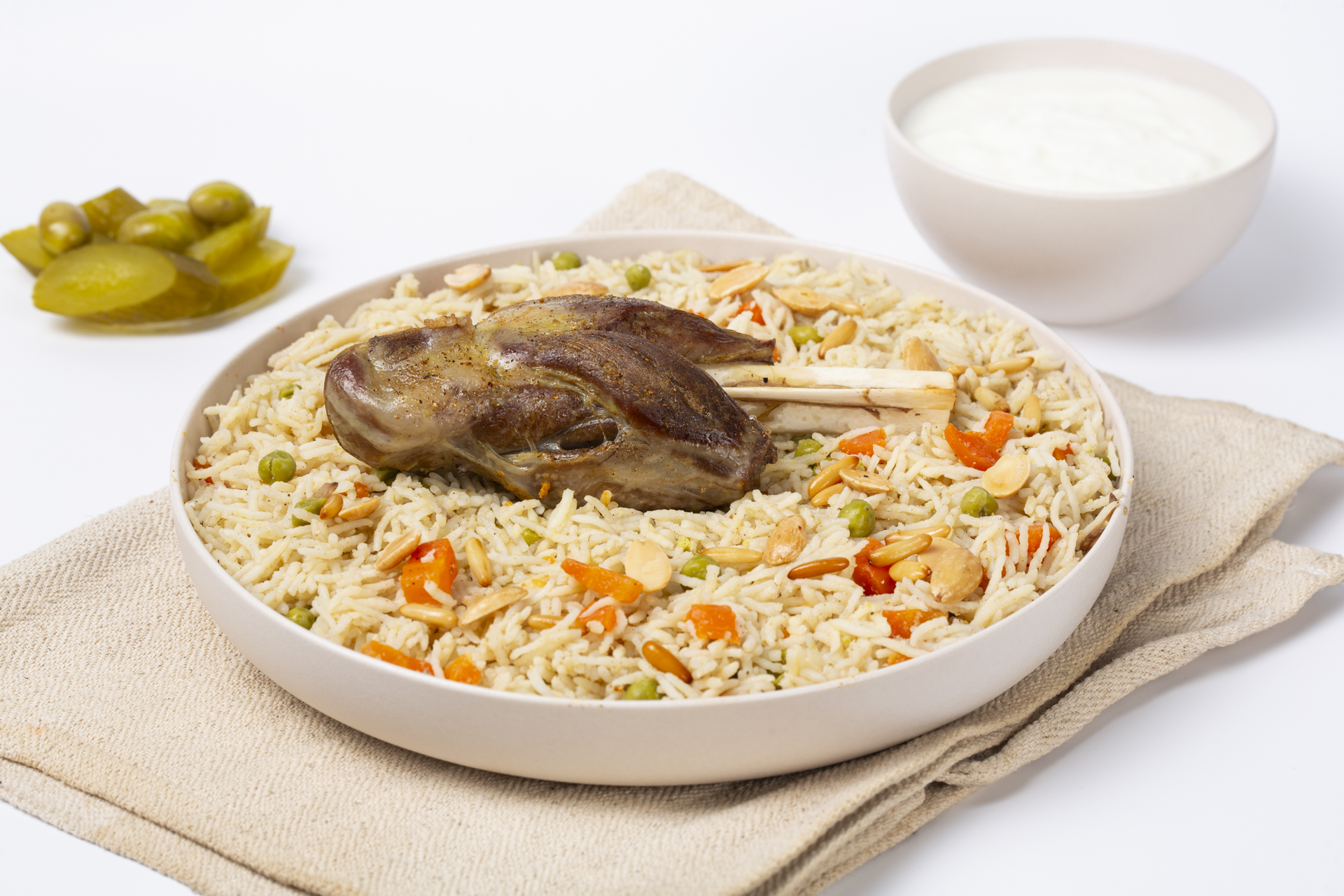Fragrant spiced rice with peas and carrots topped with your choice of tender lamb or chicken, slow cooked for deep flavor. Finished with toasted pine nuts and almonds.