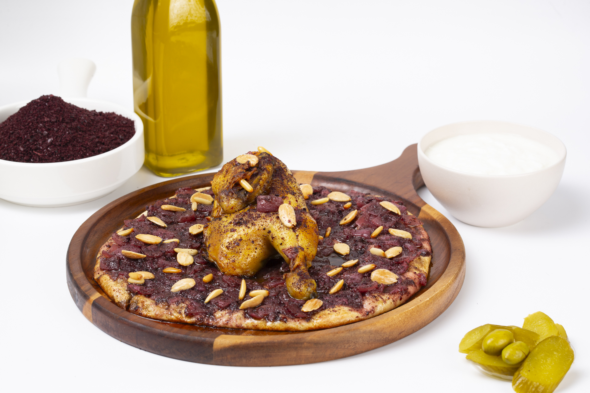 A proud symbol of Palestinian heritage. Tender chicken baked over taboon bread soaked in olive oil and baladi sumac, mixed with caramelized onions and topped with toasted pine & almond nuts.