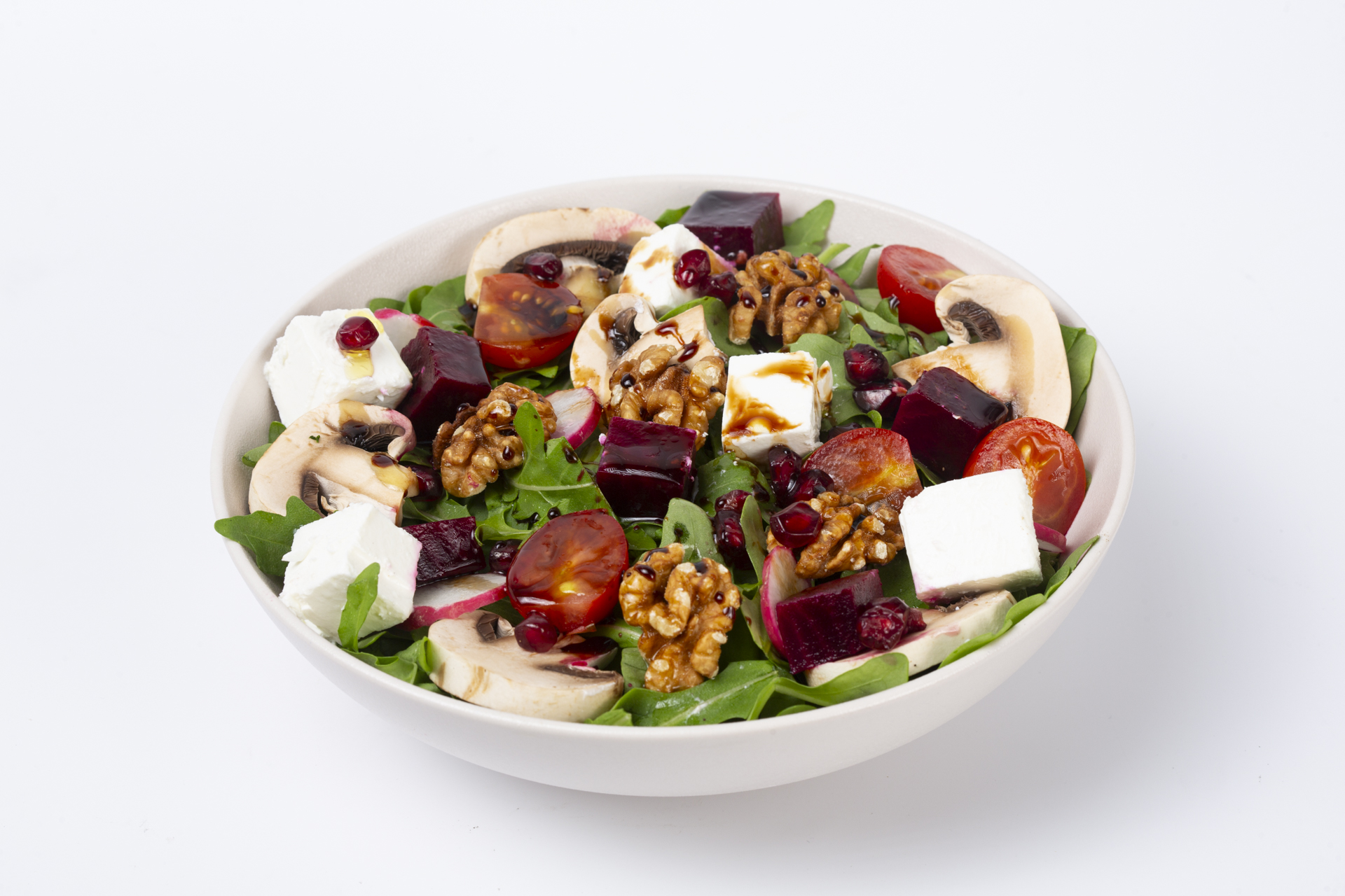 Chef salad made with wild rocca leaves, cherry tomatoes, beetroot, thin onion slices, feta cheese and crunchy walnuts, all tossed in our special house dressing.